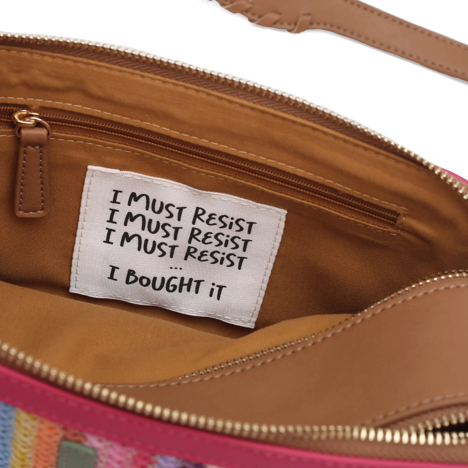 - Tessuto simil rafia con lettere patch e rifiniture in PU