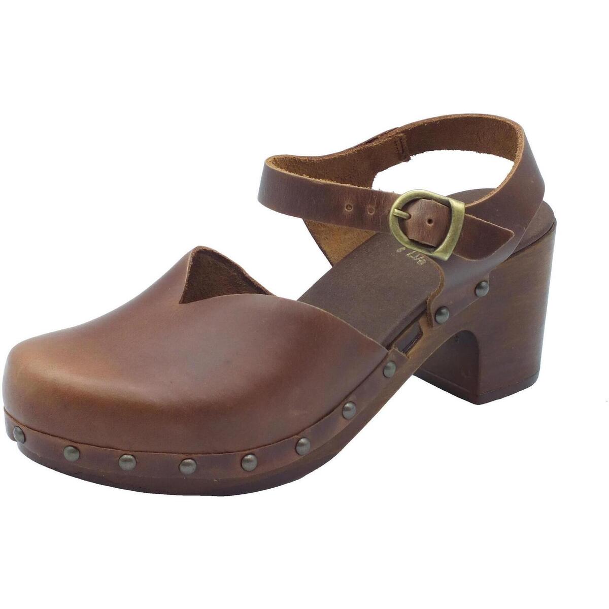 Sandalo modello zoccolo realizzato con pelle ingrassata marrone con fibia alla caviglia. Sfoderati all' interno, sottopi9ede in tessuto marrone fondo in gomma marrone effetto legno con tacco di circa 7 cm.