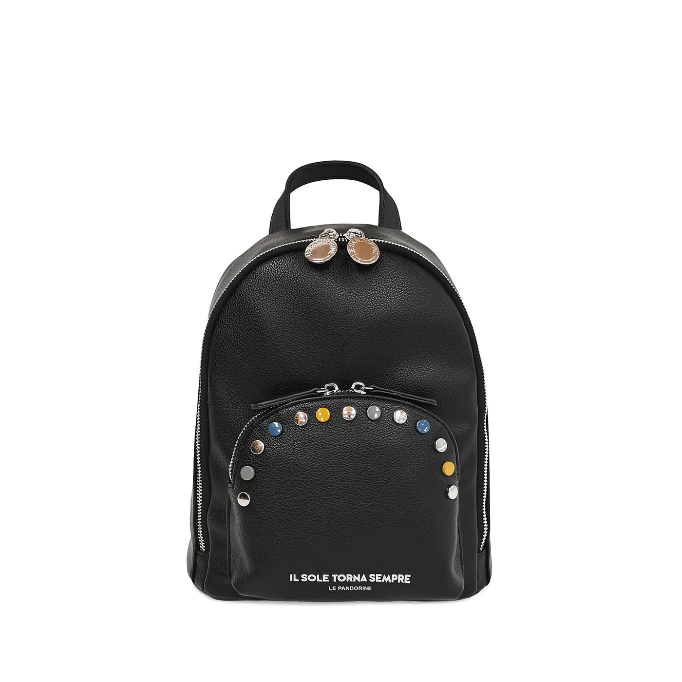 - Taschina frontale con dettaglio borchie multicolor e doppia chiusura zip